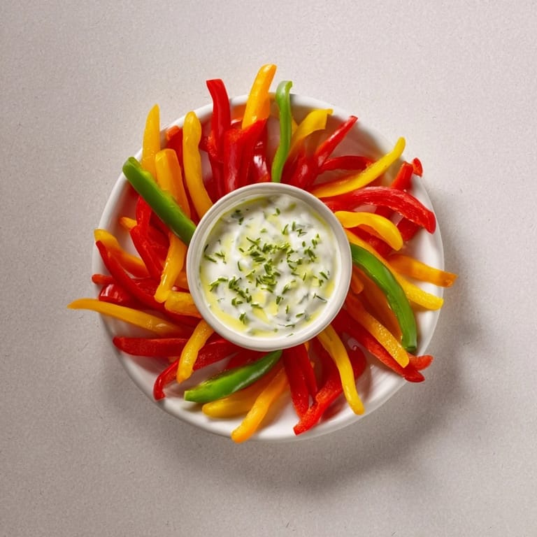 Pin This A vibrant, nutritious snack featuring crisp bell pepper strips arranged around a bowl of tangy, herbed Greek yogurt dip β perfect for parties or a quick healthy bite.