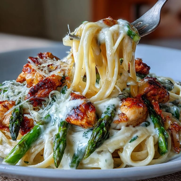 Pin This There's something about the smell of Asiago crisping in the oven that stops me mid-conversation every single time. I discovered this dish on a Tuesday evening when I had chicken, leftover asparagus, and cream in my fridge, and somehow it turned into something my family actually requested again. The combination of that nutty, golden cheese crust on the asparagus with the silky pasta sauce felt like I'd accidentally created something restaurant-worthy in my own kitchen. What started as improvisation became the meal I make when I want to feel like I'm doing something special without spending hours cooking.