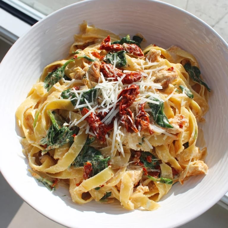 Pin This A luscious, comforting pasta dish simmered in a single pot, featuring tender noodles, sun-dried tomatoes, spinach, and a medley of fresh herbs in a velvety garlic cream sauce.