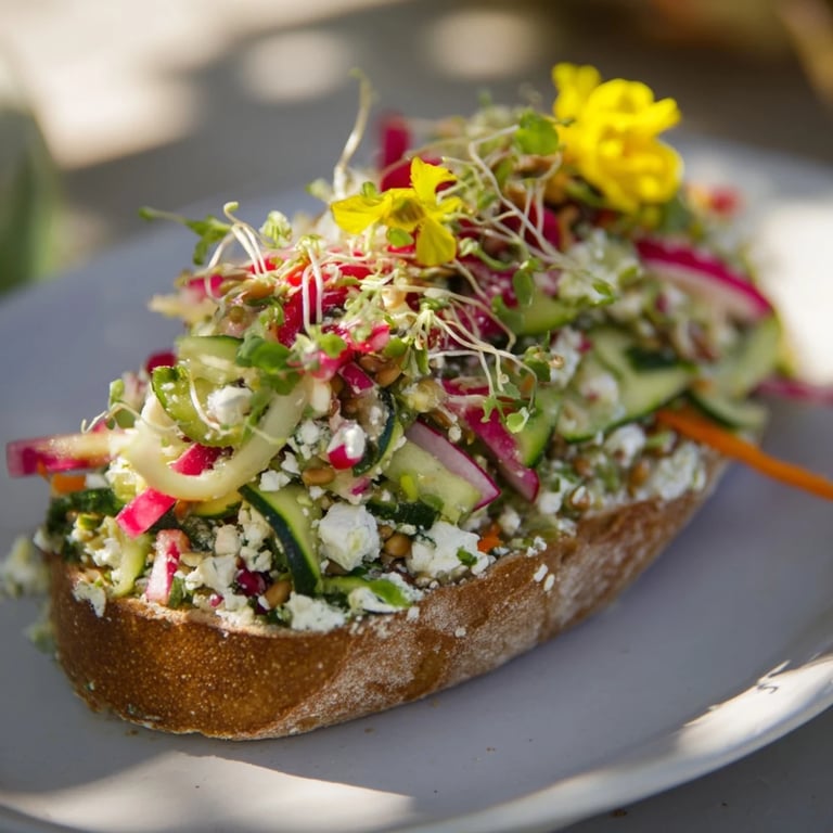 Pin This A vibrant, open-faced sandwich featuring crisp garden vegetables, creamy herbed cheese, and rustic bread, evoking the freshness of a spring meadow. Perfect for light dinners or garden lunches.