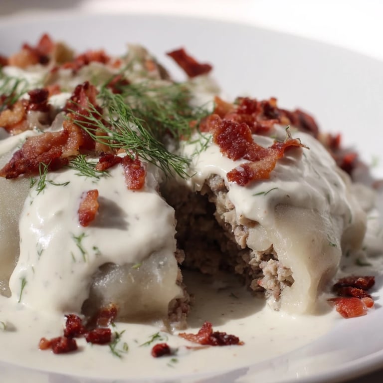 The sauce combines crisp diced bacon, golden sautéed onions, sour cream, and fresh dill, gently heated without boiling for a rich finish.