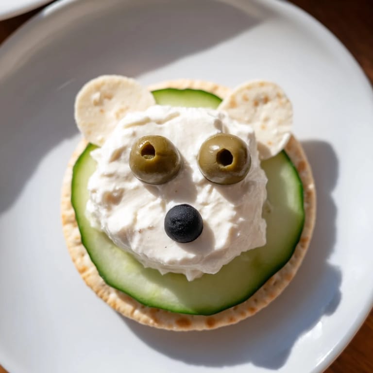 - Using a small spoon or piping bag, drop a rounded mound of cream cheese mixture onto the cucumber slice as the polar bears head.