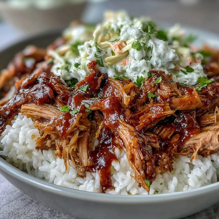 A pulled pork bowl works because every component has a purpose and personality. The pork is rich and smoky, the coleslaw is cool and bright, the rice is neutral and absorbing, and the sauce ties everything together. It's not complicated or pretentious, but it's also not boring—each layer makes the others taste better. This is the kind of food that people come back for seconds of without being asked.