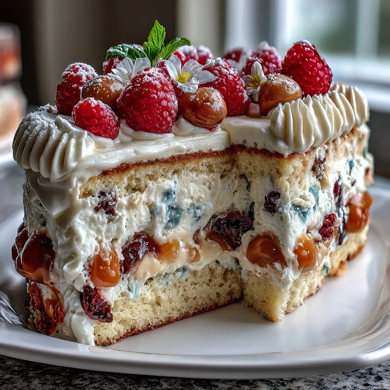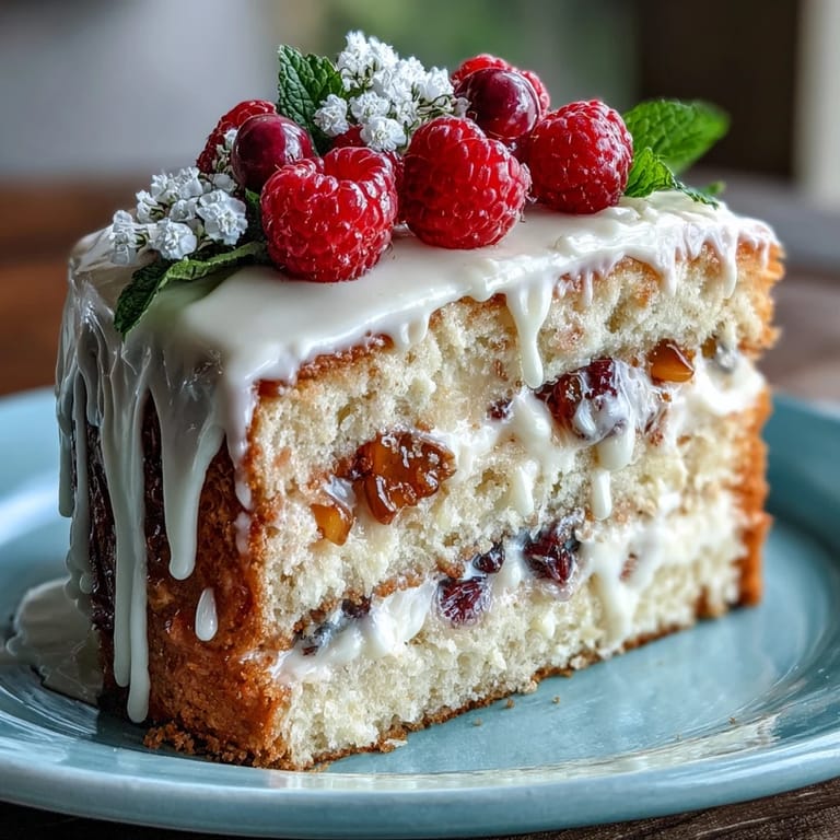 I made this for my sister's 30th birthday at a backyard picnic, and watching people cut into those clean layers felt like watching something precious happen. The pale yellow cake, that jewel-toned curd peeking through, the white frosting dotted with berries—it photographed beautifully, but more importantly, it tasted like springtime in a bite.