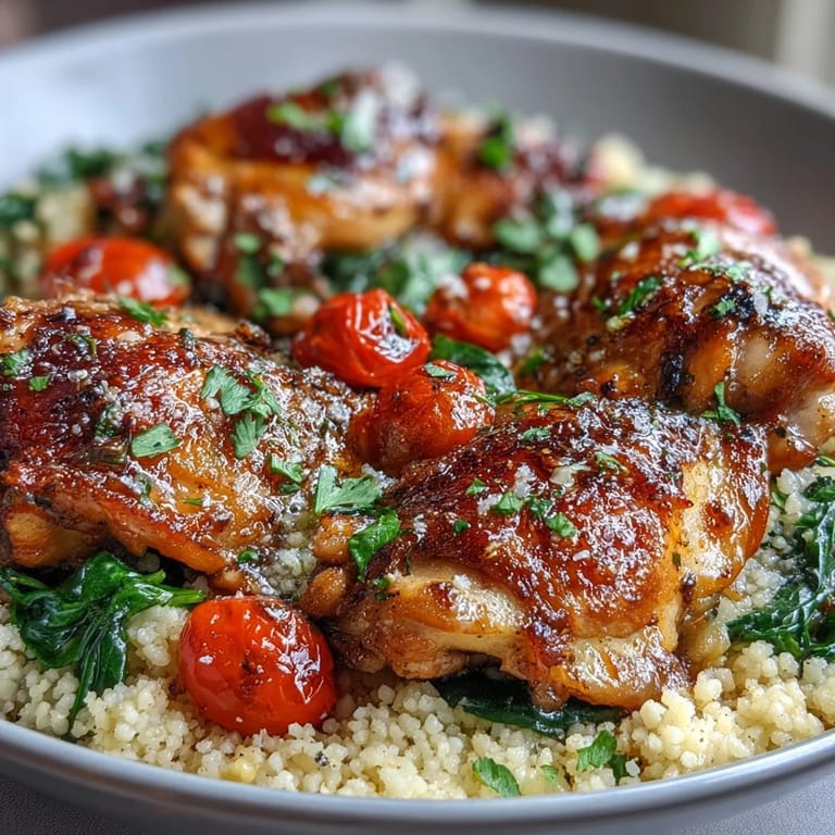 - Place your seared chicken thighs back into the skillet, nestling them on top of the couscous mixture like they're settling in for a nap. Cover with a lid and reduce heat to low, letting it bubble gently for eight to ten minutes until you can fluff the couscous with a fork and the chicken reaches an internal temperature of 165°F.